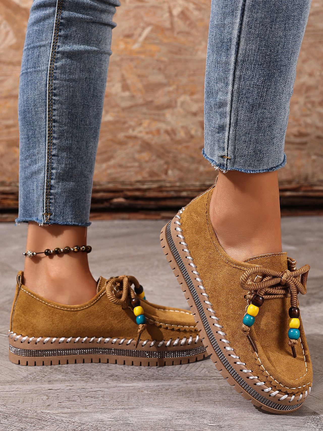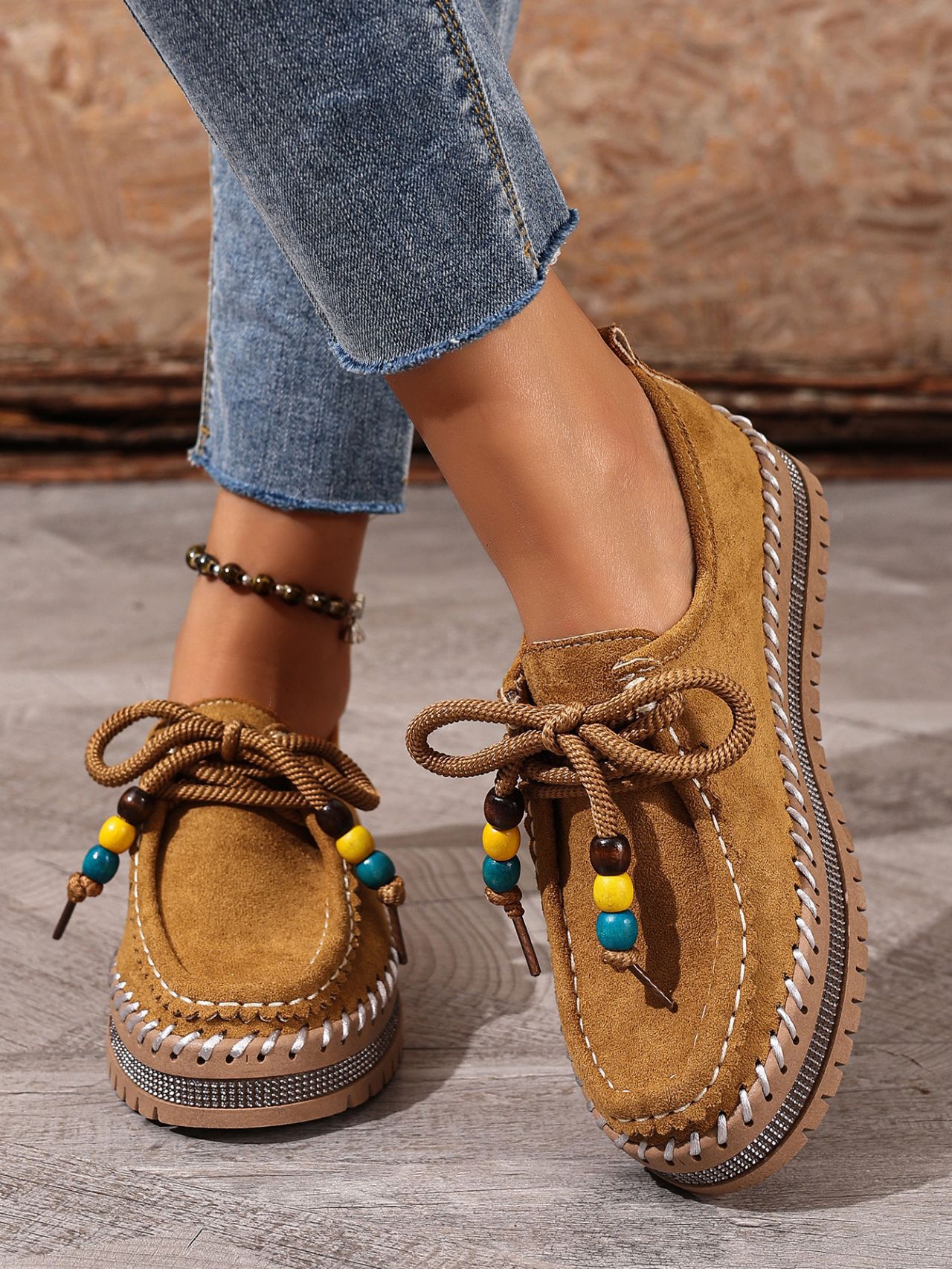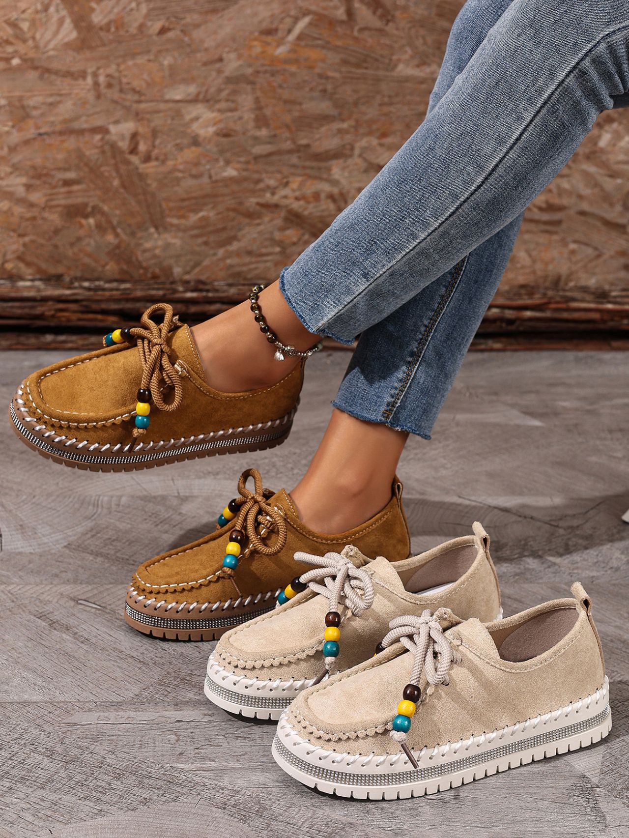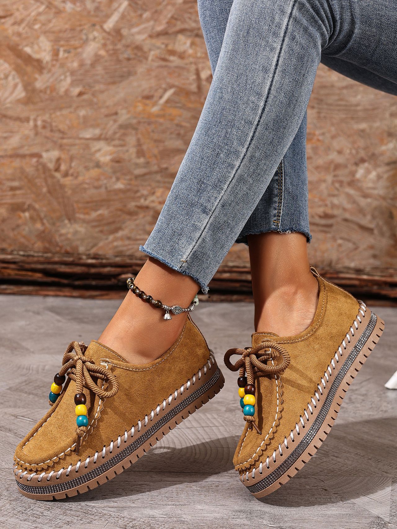 Color Options: Beige, Camel Available Sizes: 36, 37, 38, 39, 40, 41, 42, 43 Gender: Female Style: Retro / Casual / Comfortable Flats Upper Material: Suede (Artificial Leather) Toe Shape: Round Toe Closure Type: Lace-Up Sole Material: Rubber Sole Process: Glued Leather Type: Artificial Leather Features: Soft-bottom, thick-sole, flexible, lightweight, non-slip, full-covered design