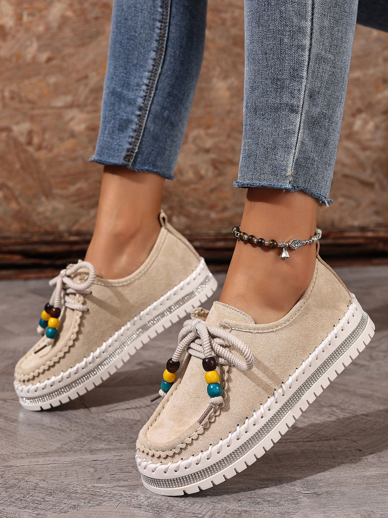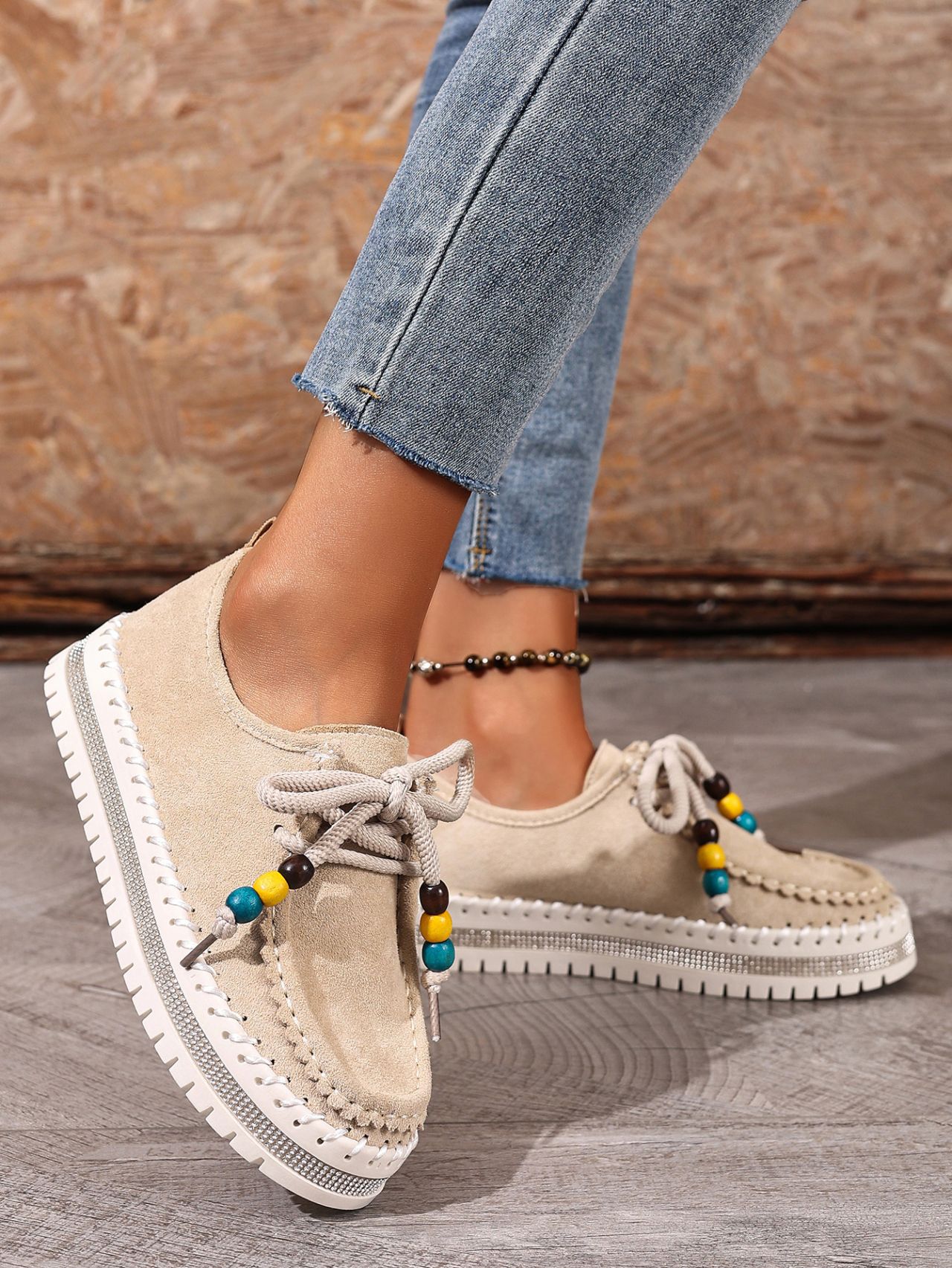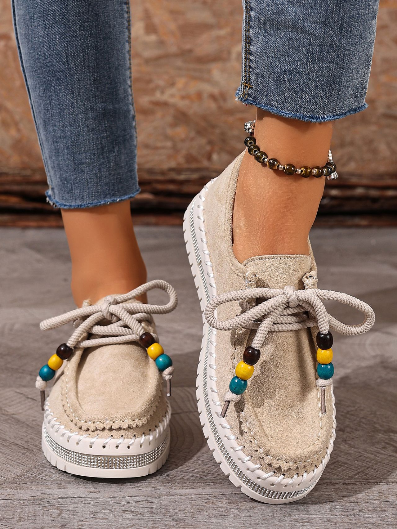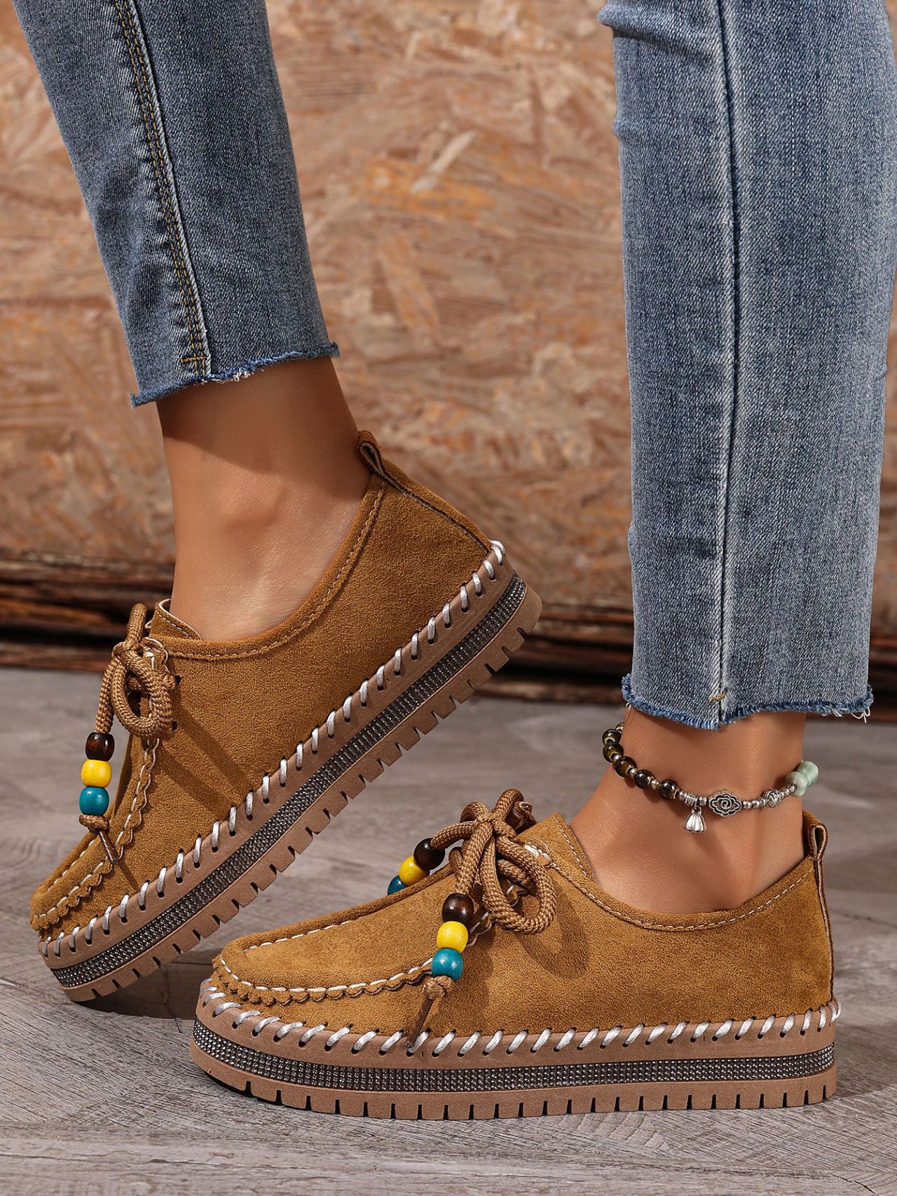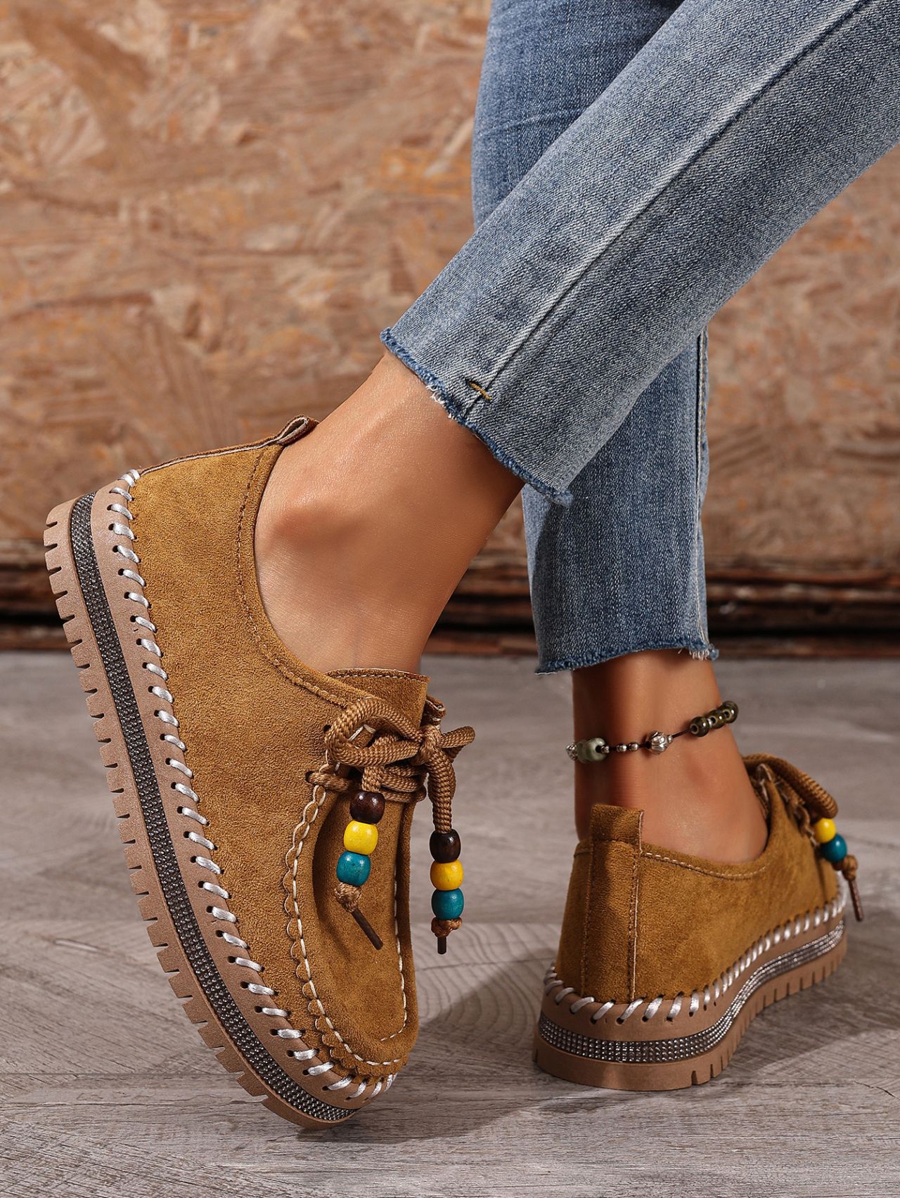 Color Options: Beige, Camel Available Sizes: 36, 37, 38, 39, 40, 41, 42, 43 Gender: Female Style: Retro / Casual / Comfortable Flats Upper Material: Suede (Artificial Leather) Toe Shape: Round Toe Closure Type: Lace-Up Sole Material: Rubber Sole Process: Glued Leather Type: Artificial Leather Features: Soft-bottom, thick-sole, flexible, lightweight, non-slip, full-covered design