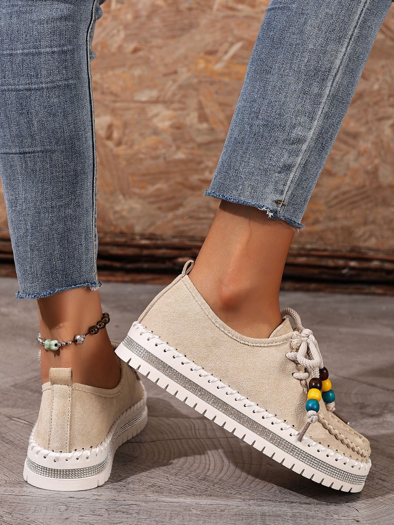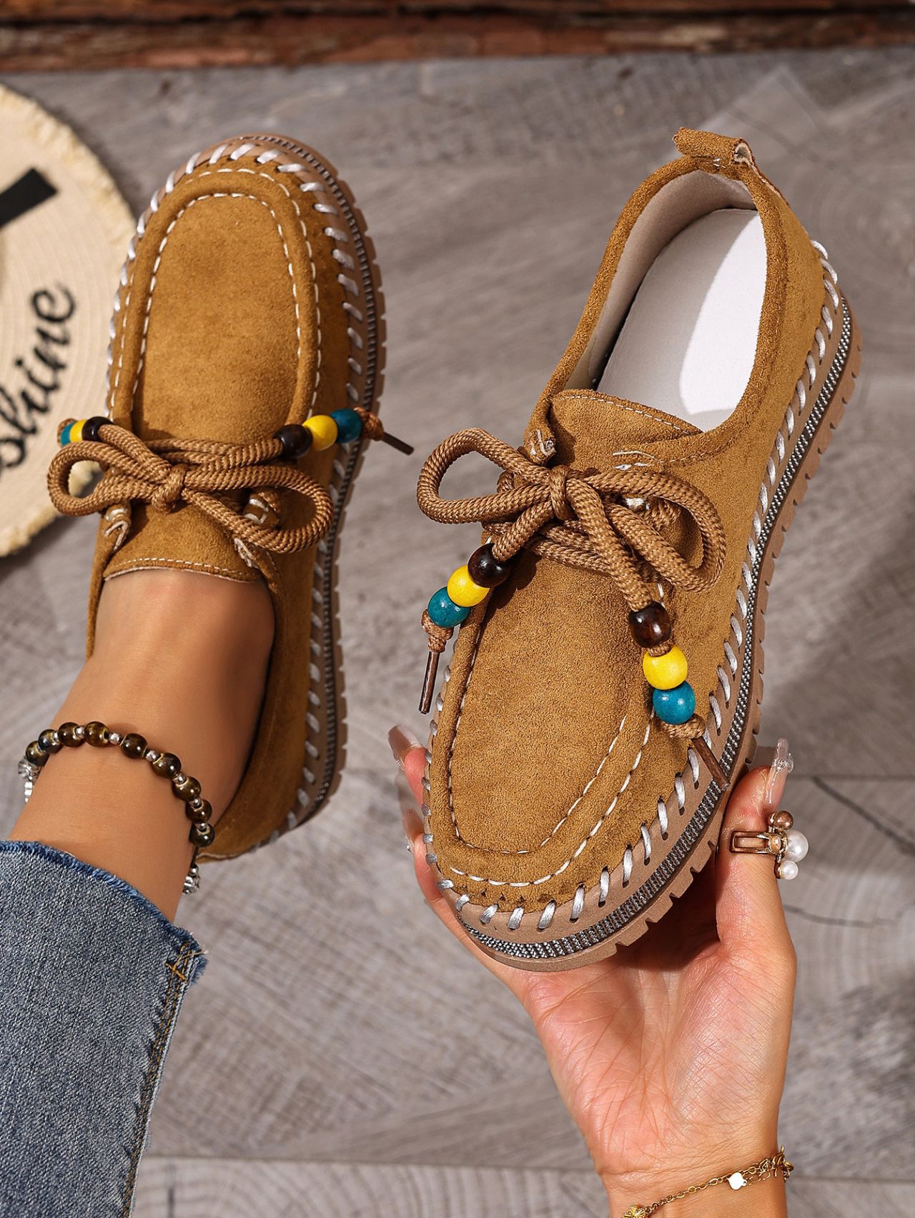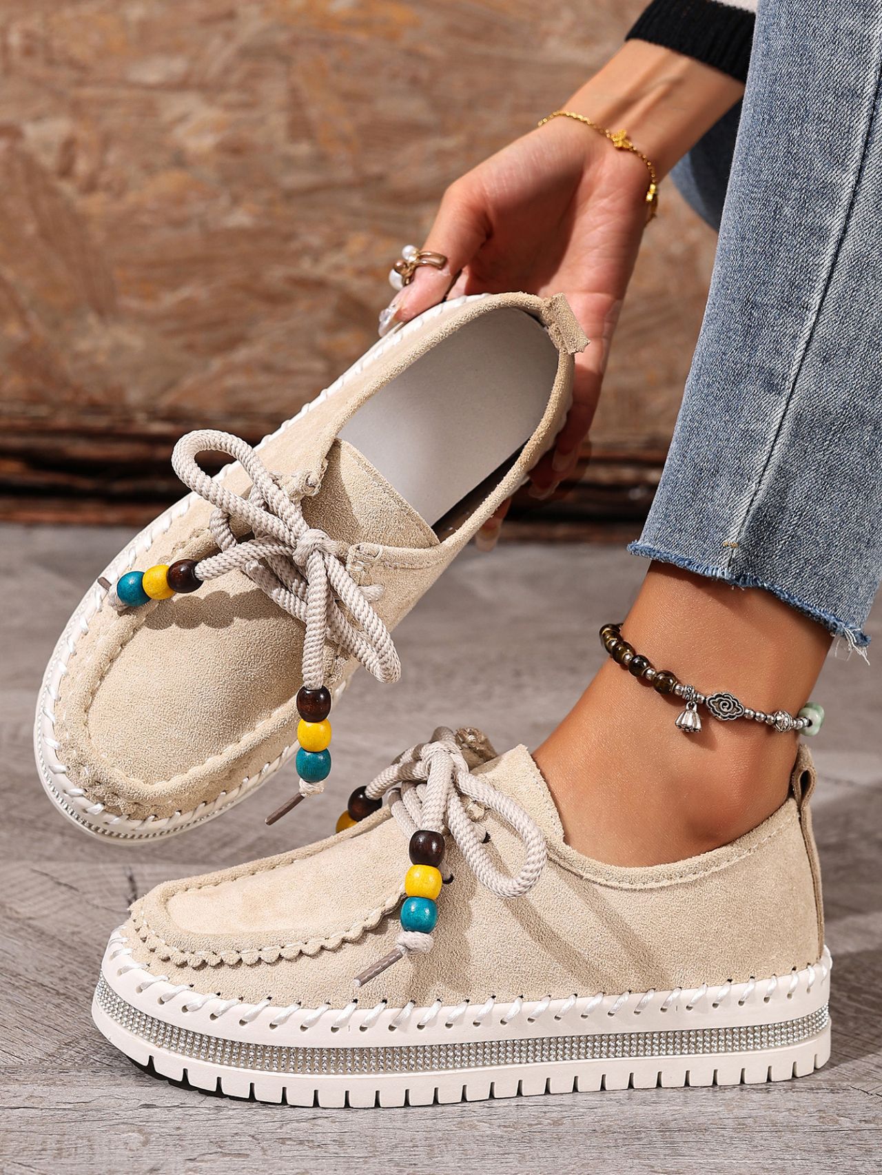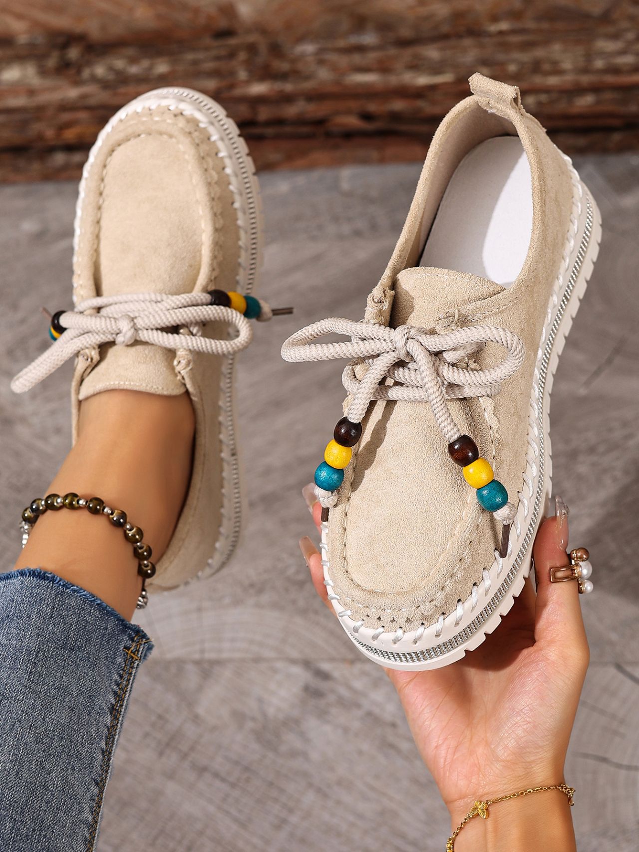 Color Options: Beige, Camel Available Sizes: 36, 37, 38, 39, 40, 41, 42, 43 Gender: Female Style: Retro / Casual / Comfortable Flats Upper Material: Suede (Artificial Leather) Toe Shape: Round Toe Closure Type: Lace-Up Sole Material: Rubber Sole Process: Glued Leather Type: Artificial Leather Features: Soft-bottom, thick-sole, flexible, lightweight, non-slip, full-covered design